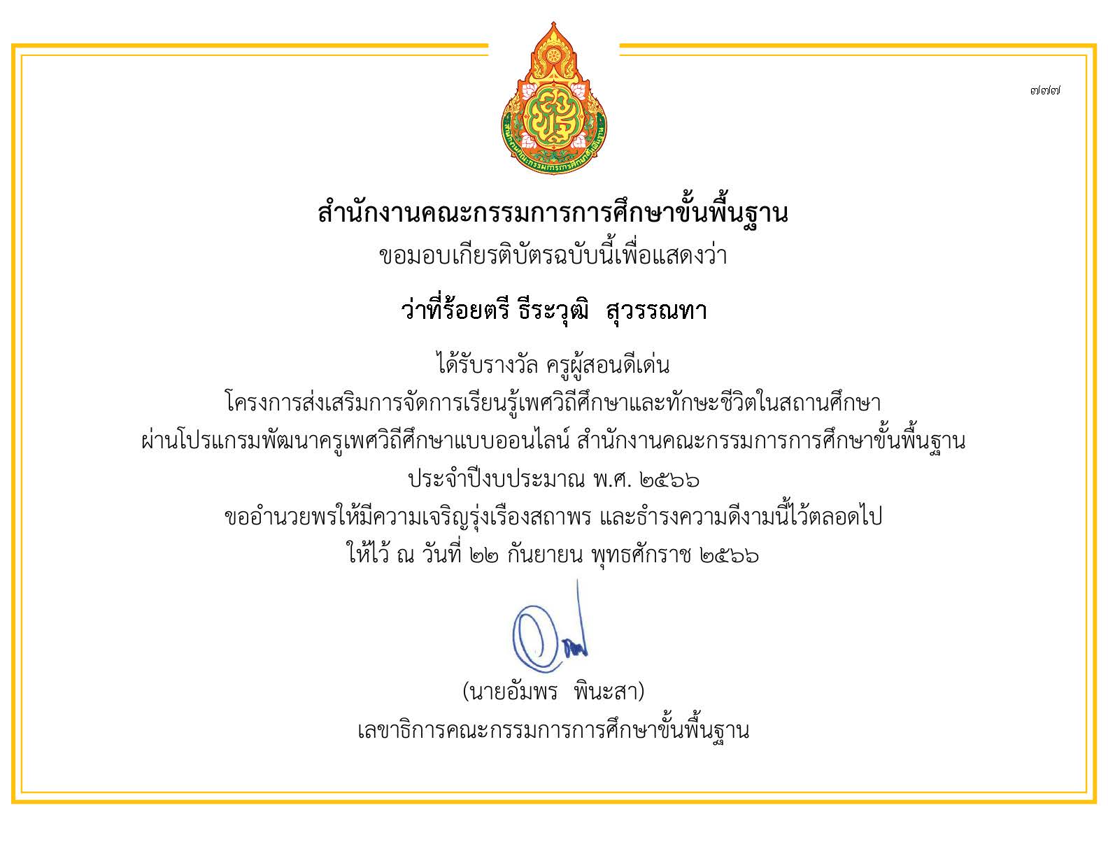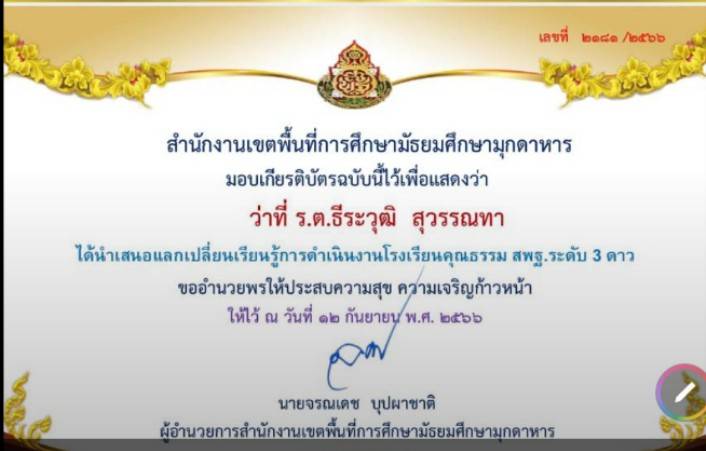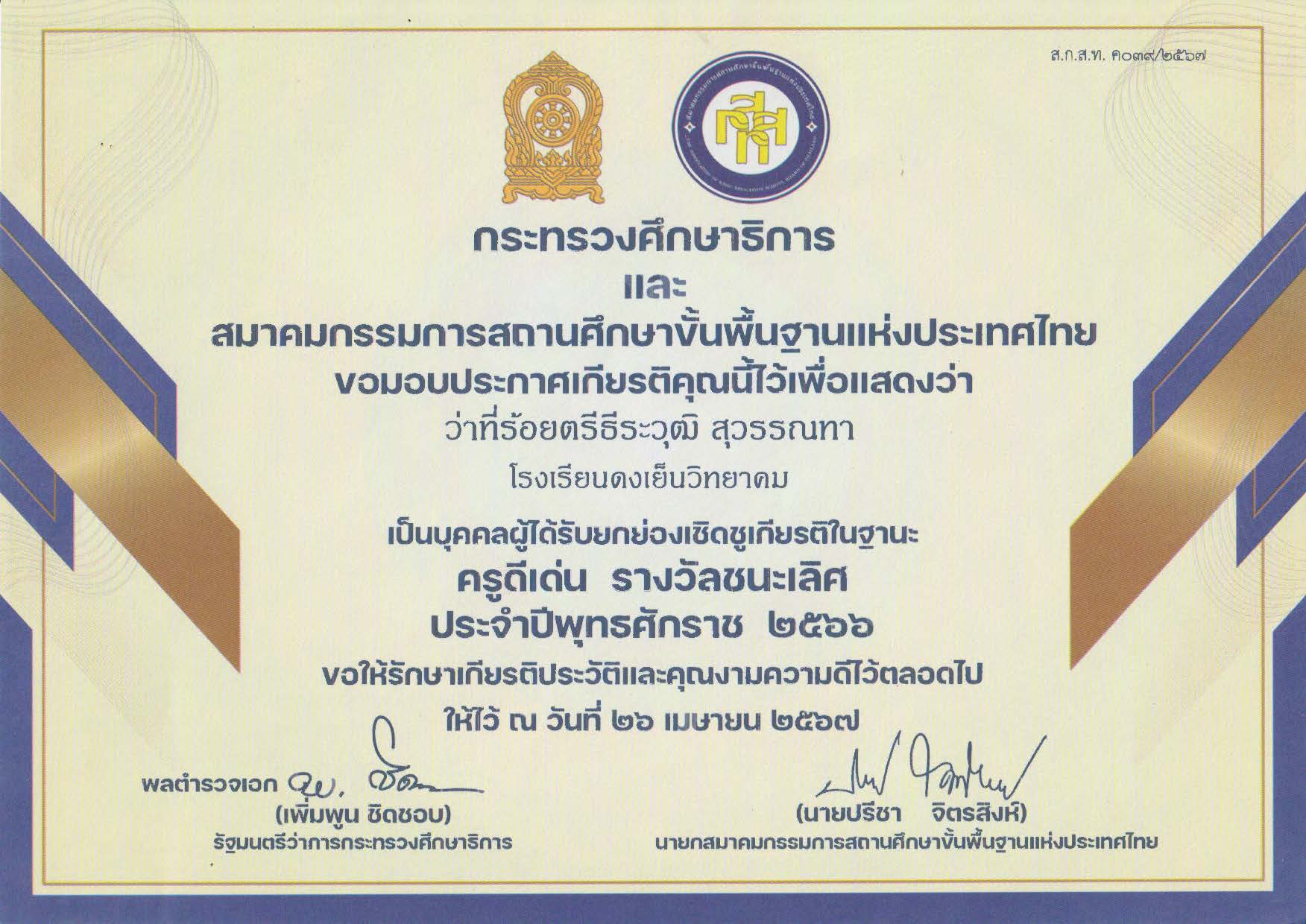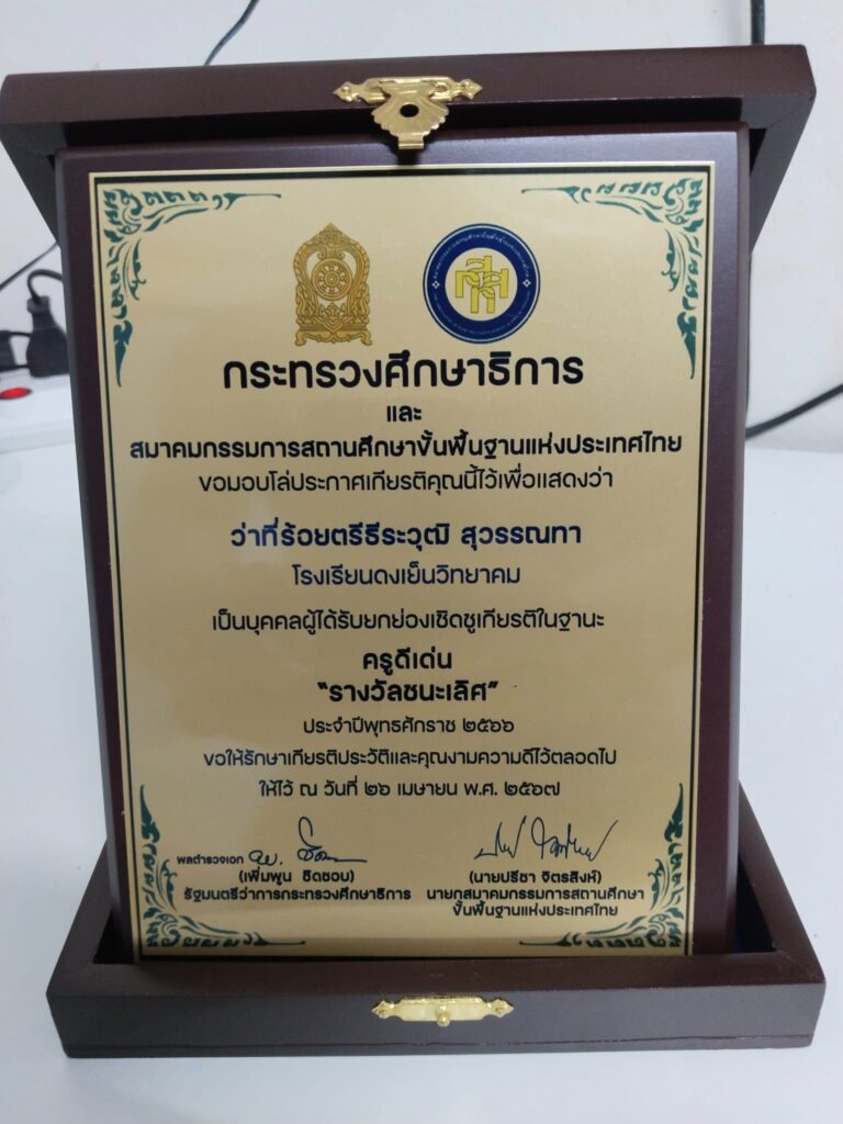 ได้รับโล่รางวัลบุคคลดีเด่น ประเภท ครูดีเด่น รางวัลชนะเลิศ ประจำปี พ.ศ. 2566 โดยสมาคคณะกรรมการสถานศึกษาขั้นพื้นฐานแห่งประเทศไทย