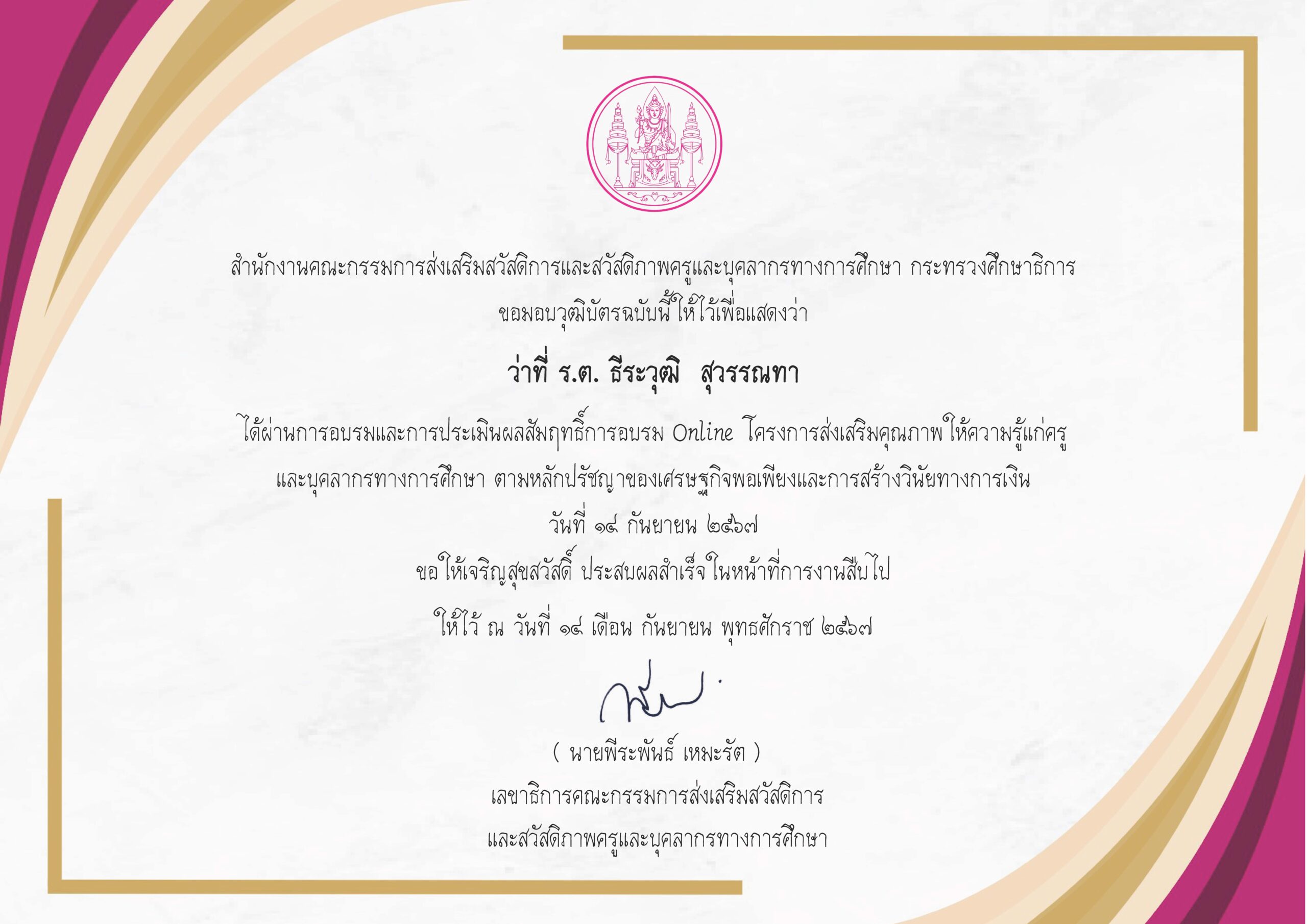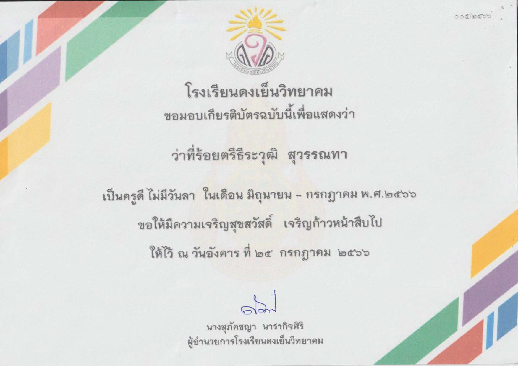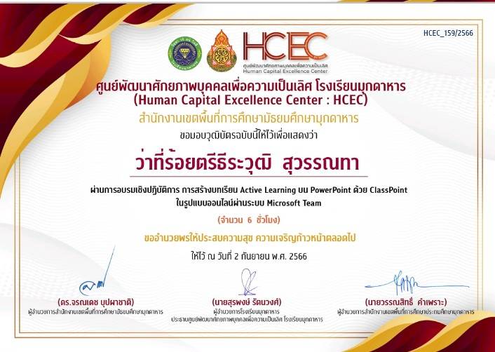 ได้รับโล่รางวัลบุคคลดีเด่น ประเภท ครูดีเด่น รางวัลชนะเลิศ ประจำปี พ.ศ. 2566 โดยสมาคคณะกรรมการสถานศึกษาขั้นพื้นฐานแห่งประเทศไทย
