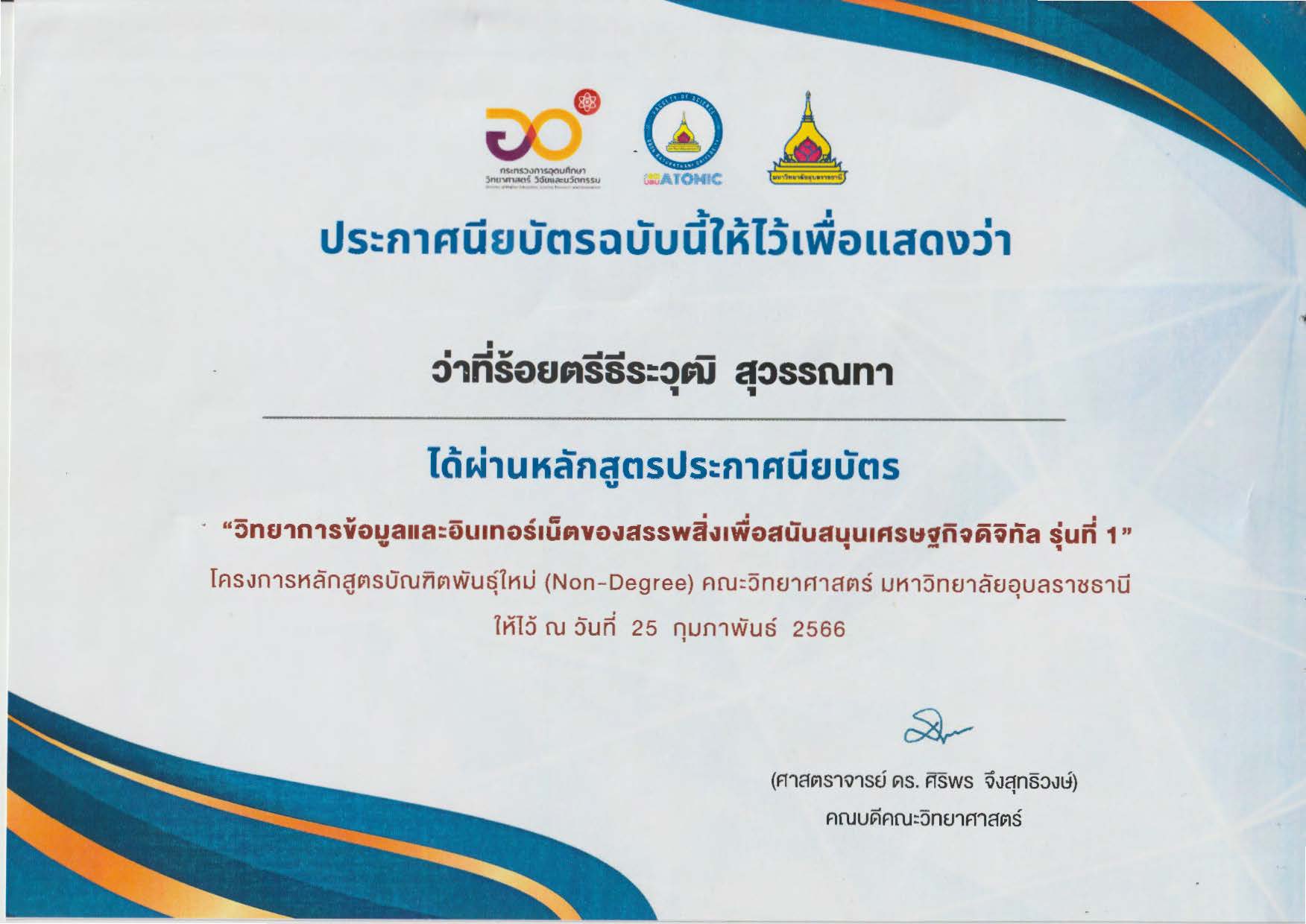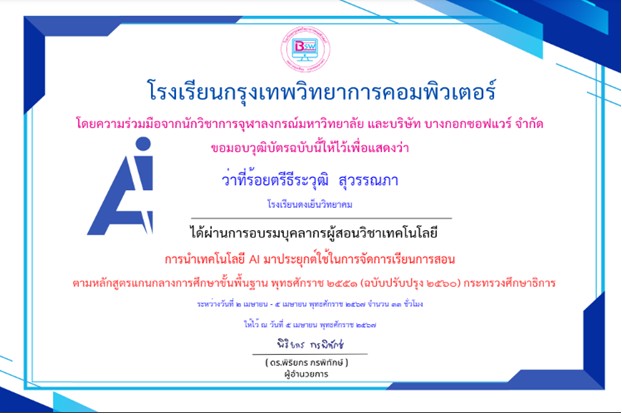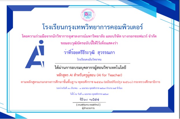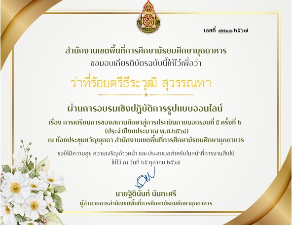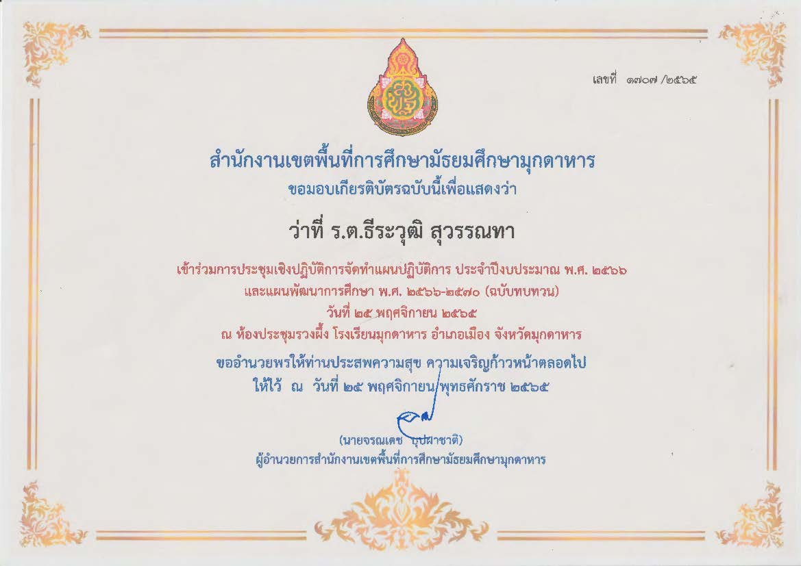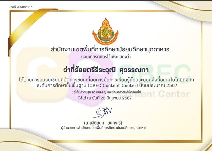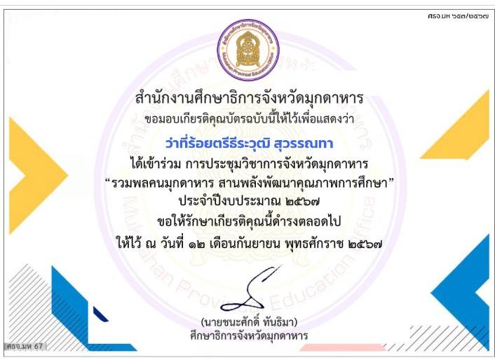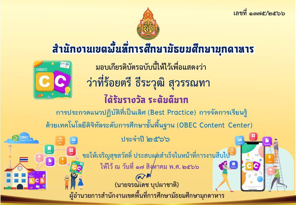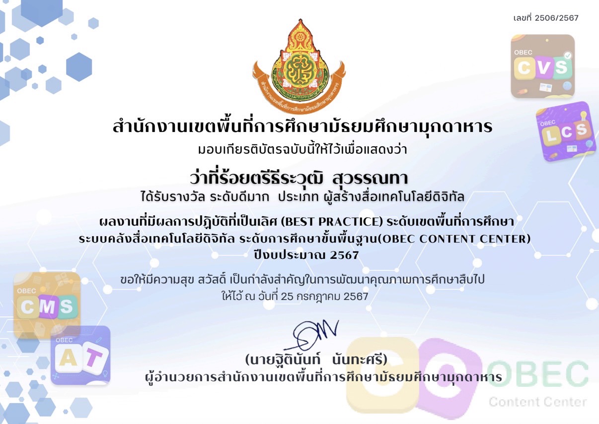 ได้รับรางวัล ระดับดีมาก การประกวดผลงานที่มีผลการปฏิบัติงานที่เป็นเลิศ (Best Practice) ด้านการจัดการเรียนรู้ (ครูผู้สอน) โครงการ Innovation For Thai Education นวัตกรรมการศึกษา เพื่อพัฒนาการศึกษา ประจำปีงบประมาณ พ.ศ.2567 โดยสำนักงานศึกษาธิการจังหวัดมุกดาหาร