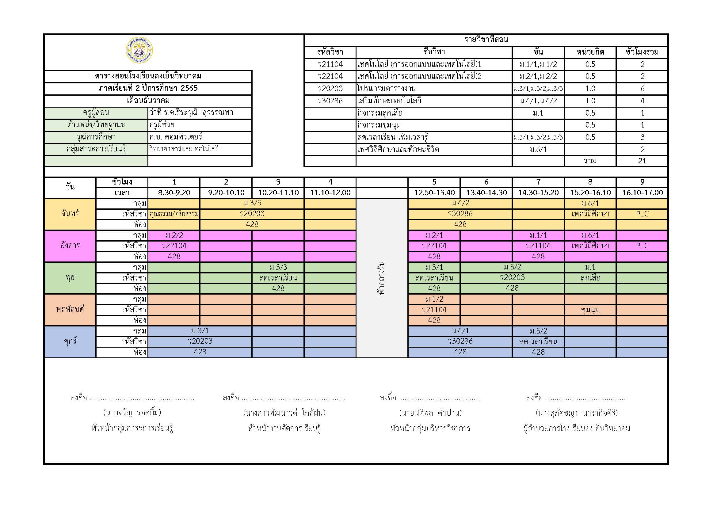 ตารางเรียนภาคเรียนที่ 2/2565